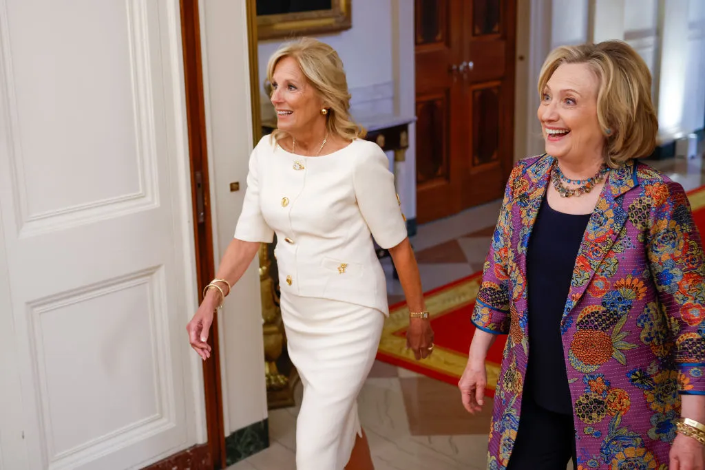 Hillary Clinton (right) wearing Mi Jong Lee at the 2023 Praemium Imperiale Laureates.